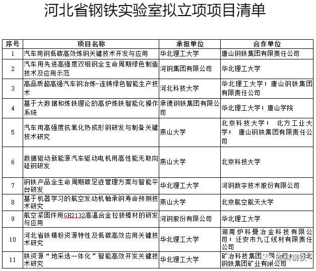 按照《河北省省级科技计划项目管理办法》等有关规定,省科技厅组织了河北省钢铁实验室研发项目评审工作,现对拟立项项目进行公示(见附件)。公示期为5天,公示时间为2023年10月19日-23日。 对公示结果有异议的,请于公示期内以书面形式向河北省科学技术厅反映,逾期不予受理。凡以单位名义反映情况的材料需要加盖单位公章,以个人名义反映情况的材料应署实名并附联系方式,不受理匿名材料。 通信地址:石家庄市裕华东路105号科技大厦1237房间 收 件 人:河北省科学技术厅科技平台与基础研究处 联系方式:0311-85891978 监督电话:0311-86252318 河北省科学技术厅 2023年10月19日