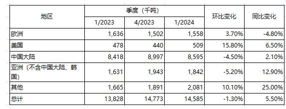2024年7月12日,世界不锈钢协会发布,2024年前三个月的数据表明,不锈钢粗钢产量与去年同比增长5.5%,达到1458.5万吨。较前一季下降约1.3%。 其中,欧洲同比下降4.8%而环比增长3.7%至155.8万吨;美国同比增长6.5%和环比增长15.8%至50.9万吨;中国大陆同比增长2.1%而环比下降4.5%至859.5万吨;亚洲(不包括中国大陆、韩国)同比增长12.9%而环比下降5.2%至184.2万吨;其他地区(巴西、俄罗斯、南非、韩国、印度尼西亚)同比增长25.0%和环比增长10.1%至208.1万吨。